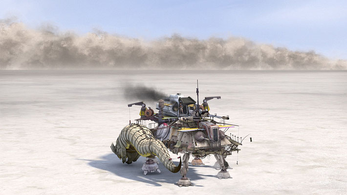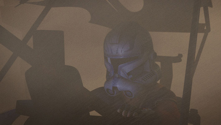 Auf Rex` Kommando wird der erlegte Joopa abgeworfen und der AT-TE macht kehrt. Er lässt den Walker direkt auf einen Sandsturm zulaufen. Dort werden sie zwar nicht gesehen, aber auch ihre Sensoren sind nicht mehr brauchbar.