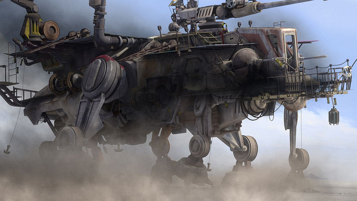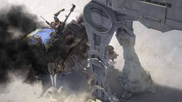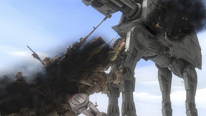 Wolffe steuert den wackeligen AT-TE direkt auf die imperialen Kampfläufer zu. Der Läufer der Klone wird schwer getroffen und sackt zusammen.