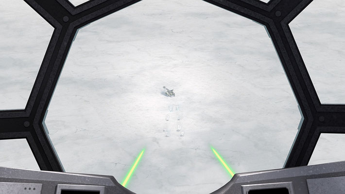 In dem Moment greift ein TIE Fighter den Kampfläufer an.