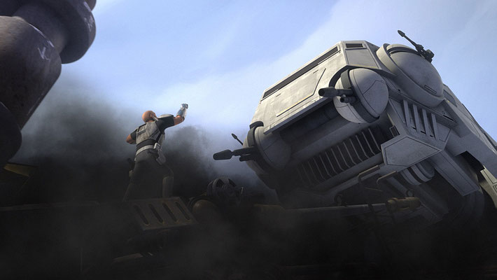 Aber die Klone lassen sich nicht so leicht aufhalten. Wolffe gelingt es, den AT-TE wieder aufzurichten und marschiert wieder auf die imperialen Truppen zu.