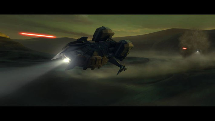 Im selben Moment ertönt das Echo der Raumschiff-Motoren aus den Schluchten. Die Slave I schwebt hinter den Jünglingen. Die Schiffsluke öffnet sich und Katooni tritt hervor. Sie fordert ihre Klassenkameraden auf, an Bord zu kommen.