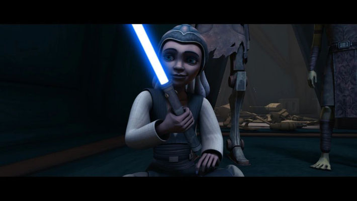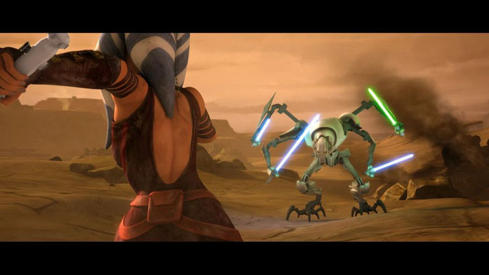 Als Grievous erscheint, bereit den Kampf fortzusetzen, vereinen sich die Jünglinge hinter Ahsoka und zünden ihre Lichtschwerter. Sie sind furchtlos und bereit für den Kampf. "So viele Lichtschwerter für meine Sammlung," stichelt Grievous.