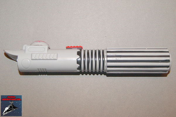 Das 18 cm lange hellgraue Lichtschwert ist für das Preis-Leistungs-Verhältnis sehr gut gelungen. Geladen wird das Schwert mit vier mit Stormtrooper-Aufklebern versehenen Scheiben (Durchmesser 1 cm). Die Scheiben werden vorne in eine Luke, die über einen leichten Einrastmechanismus verfügt, gelegt. Der rote Auslöser befindet sich gleich dahinter und muss zum Schießen nach vorne gedrückt werden. Dies ist relativ leicht und die Scheiben fliegen sogar richtig weit. In der Wohnung landen sie erst nach 8 bis 10 Metern.